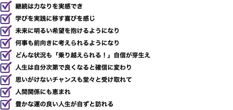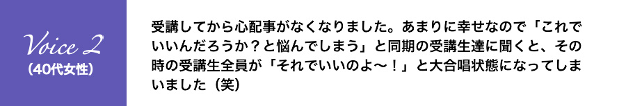 受講してから心配事がなくなりました。あまりに幸せなので「これでいいんだろうか?と悩んでしまう」と同期の受講生達に聞くと、その時の受講生全員が「それでいいのよ~!」と大合唱状態になってしまいました(笑)
