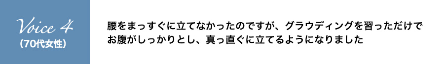 腰をまっすぐに立てなかったのですが、グラウディングを習っただけでお腹がしっかりとし、真っ直ぐに立てるようになりました