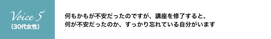 何もかもが不安だったのですが、講座を修了すると、何が不安だったのか、すっかり忘れている自分がいます