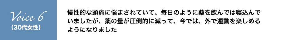 慢性的な頭痛に悩まされていて、毎日のように薬を飲んでは寝込んでいましたが、薬の量が圧倒的に減って、今では、外で運動を楽しめるようになりました