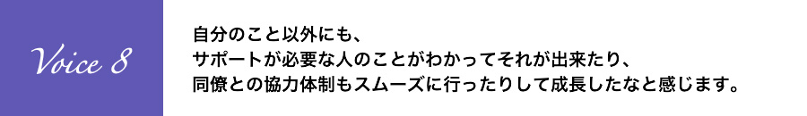 自分のこと以外にも、サポートが必要な人のことがわかってそれが出来たり、同僚との協力体制もスムーズに行ったりして成長したなと感じます。